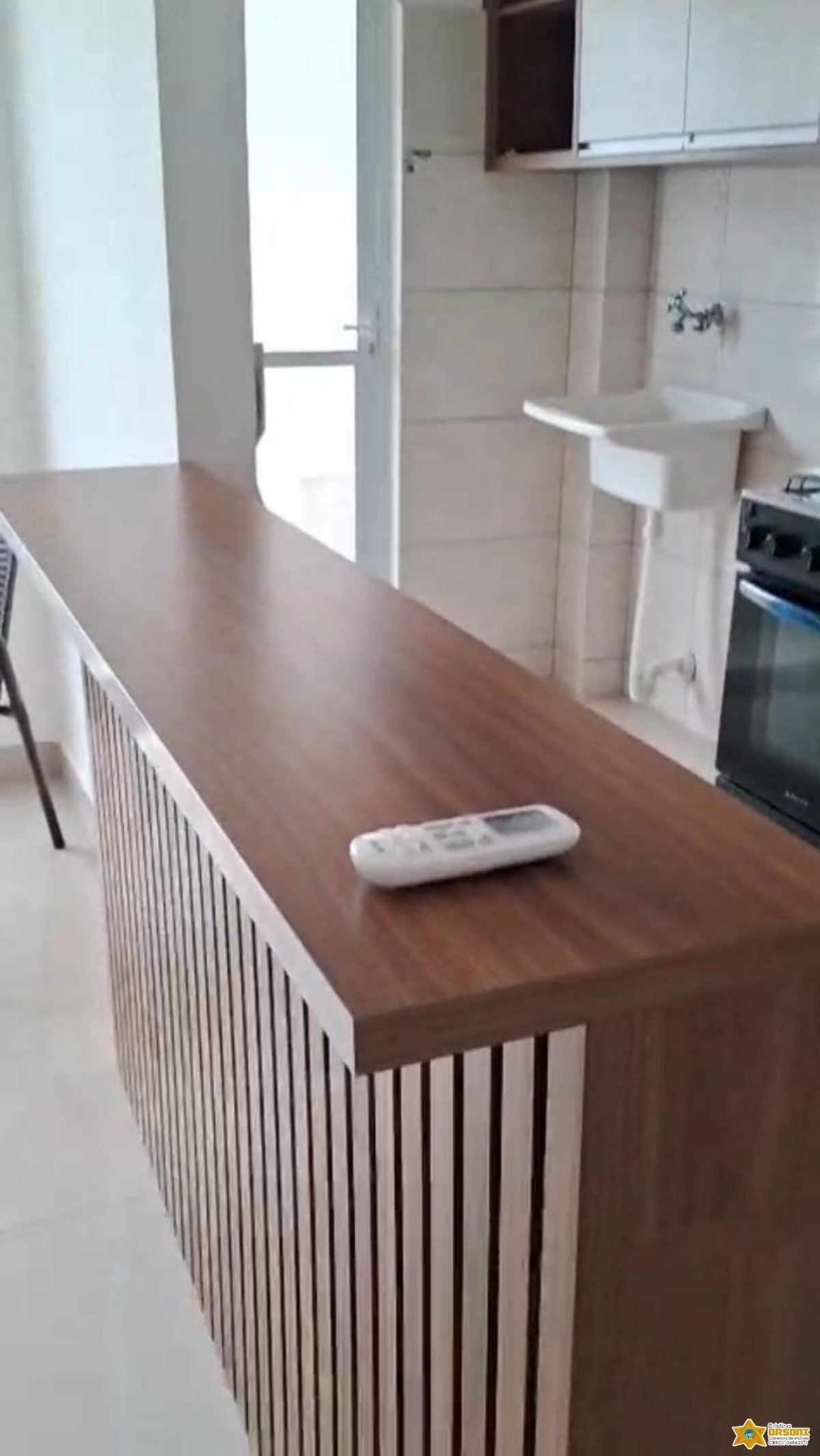 O imóvel é mobiliado e possui armário de cozinha e armário embutido, otimizando o armazenamento.